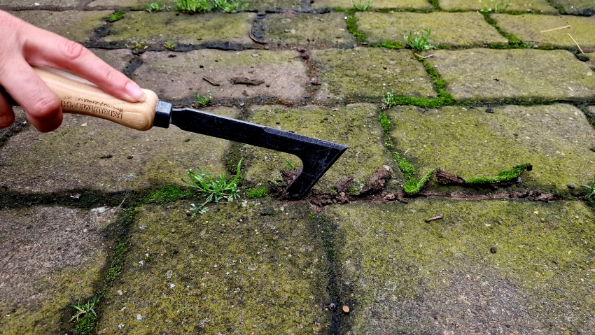 Im Mai wird das Unkraut zupfen zu deiner wichtigsten Pflegearbeit. Insbesondere im Frühjahr, denn gerade zu dieser Zeit hat das Unkraut optimale Bedingungen zum Gedeihen. Denn die Stauden sind meist noch nicht so weit, um den Boden zu bedecken. Wichtig bei Unkraut ist, nicht zu lange zu warten. Ich warte immer, wenn die Blüte am Verwelken ist und rupfe es dann raus. So hatten die Bienchen noch was davon und ich stoppe die Vermehrung über die Aussaat. - Fugen kratzen