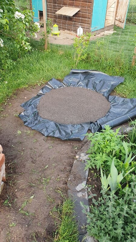 Danach hieß es erstmal buddeln und Rasen entfernen. Wie immer haben uns die Hühner dabei geholfen und gleich alles was keuchte und fleuchte aufgemampft. Da der Bottich aus Holz war, war uns wichtig, dass kein Bodenkontakt besteht, da das Holz sonst nur weiter faulen würde. Also legten wir Folie unter den Bottich. Gepaart mit einer Splittschicht, damit wir den Bottich absolut gerade aufstellen konnten. Danke an den Erfinder der Wasserwaage.